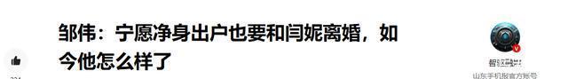 邹伟的净身出户 随着闫妮出去拍戏的时间越来越多,邹伟也尝试找过闫妮谈这件事,想看看能不能让闫妮少接拍一些戏,多陪陪自己的家人。但是闫妮又怎么可能肯放过这些机会,娱乐圈只要你不排新戏,过段时间观众就把你忘干净了。