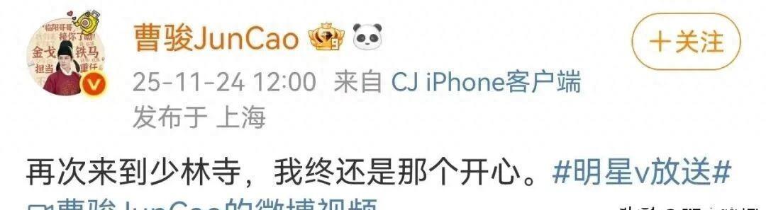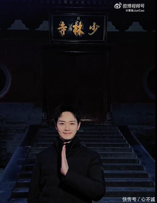 视频中,曹骏来到《真命小和尚》的拍摄地——少林寺,复刻了当年剧中角色“开心小和尚”的经典姿势。
